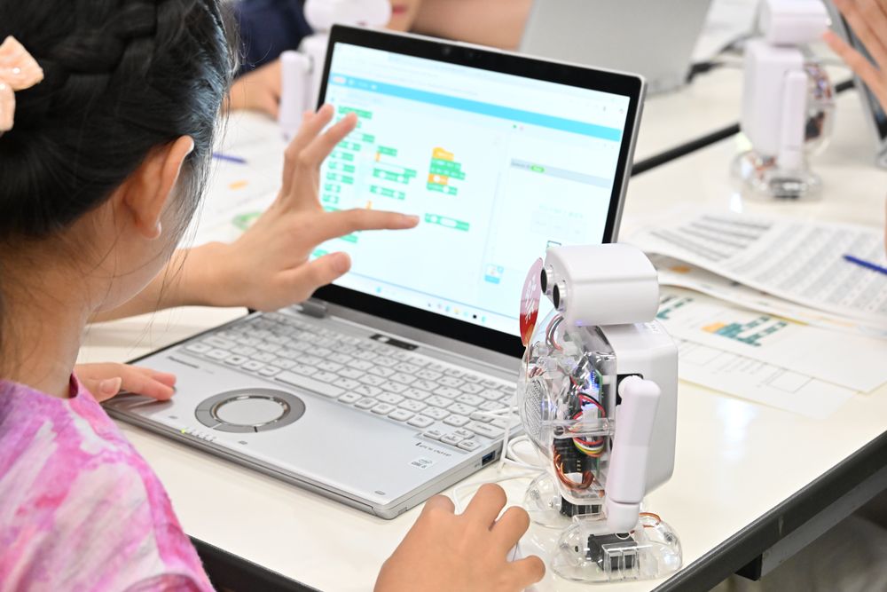 教育用プログラミング環境「Scratch」を使ったプログラミング体験。子どもたちは、ゼミ学生たちを先生にマンツーマンでプログラミングを学んだ。パソコン上のキャラクターの動きを設定して遊ぶゲームや、実際のロボット(Qumcum)を操作するものなど多彩な内容で、いずれも子どもたちの独創性が光った。東京都から来た小学1年生の男の子は「キャラクターを自分の思った通りに動かすのが面白かった」とプログラミングの楽しさを実感していた。