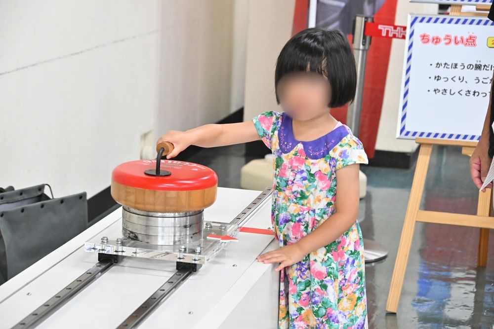 産業用ロボットに触れる機会がない子どもたちにとって貴重な体験になったようだ。子どもたちはロボットの軸がどんな動きをするかの説明を受けつつ、ロボットを操作する主観を待ちきれない様子。実際の操作は、家庭用ゲーム機での操作に慣れはあるものの、どこか勝手が違うよう。父親と東京都から訪れた小学4年生の男の子は「ロボットを操作する装置が重かったけど楽しかった」と、お土産の缶バッチを手に体験を振り返った。