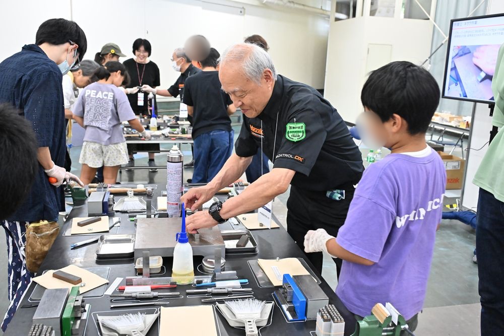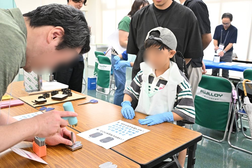 子どもたちに板金加工を知ってもらおうと、金属板を使ったクジラ型のペン立てとオリジナルチャームの製作に挑戦してもらった。子どもたちは力の要る作業を家族に助けてもらい、完成すると親子揃って満面の笑み。チャームづくりでは、酸化被膜の作用でチャームが自分の選んだ色に変わる様子に興味津々。東京都から父親らと訪れた小学4年生の女の子は「色が変わる様子が見られて楽しかった」と、うれしそうにチャームを撫でた。