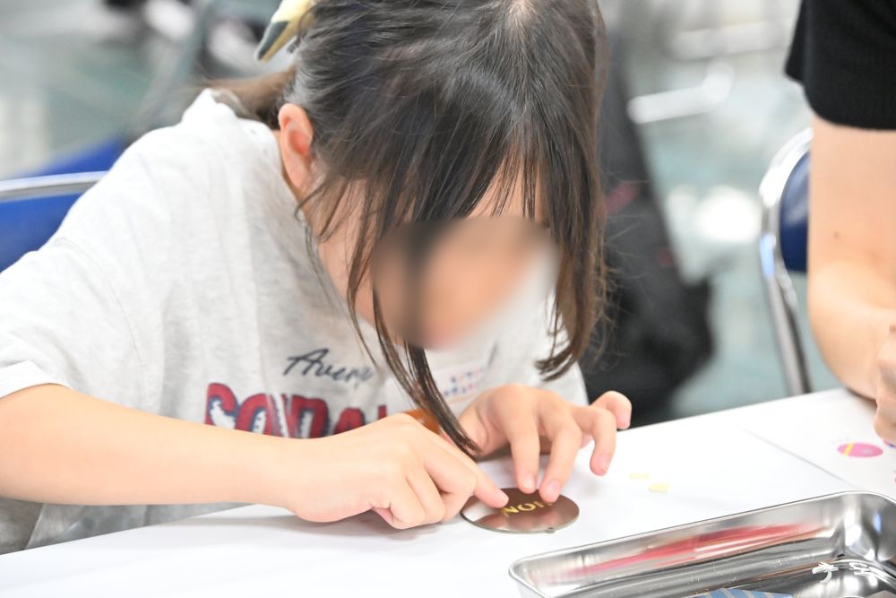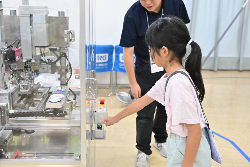 オプテックス工業のプログラムは、子どもたちが自動機で自分だけのオリジナル缶バッチを作るという内容。自ら組み立てたロボットハンドと、紙に描いたデザインをそれぞれ自動機にセット。自動機は内部が見えるようになっていて、子どもたちは自作のロボットハンドが動き、デザインが缶バッチになる様子を食い入るように見つめた。家族と千葉県から訪れた小学4年生の女の子は「完成までの動きが見られて良かった」とうれしそうな表情だった。