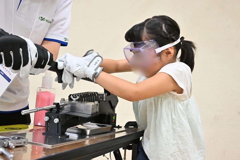 基幹技術の鋳造を再現し、鋳物キーホルダーを作るプログラムを実施した。子どもたちは初めて触れる鋳物の技術に目を輝かせながら、鋳型作りから鋳造までを体験した。自分だけのオリジナルキーホルダーをもって記念撮影するエリアには長い行列もできていた。東京都から来た小学5年生の女の子は「砂型を作るときの容器に砂を詰める作業が大変だったけど、きれいな形のキーホルダーができて良かった」と満足した表情で話した。