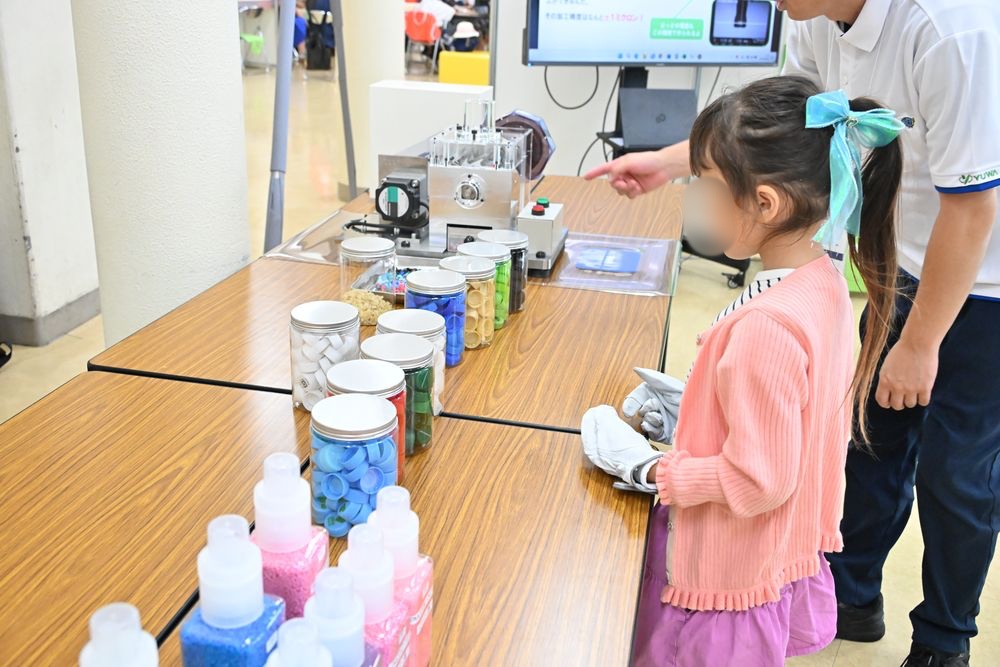 子どもたちに小型の射出成形機を作ったプラスチック製品づくりを体験してもらった。安全を徹底するため、ゴーグルやグローブも用意し、装着した子どもたちもどこか興奮気味。「さらさらした素材がドロドロになり、それがリボンや車など、いろいろな形に変わって驚いた」と、神奈川県から両親、弟と一緒に訪れた小学6年生の女の子。材料になったペットボトルのキャップを見返していた。資源循環も同時に感じたようだ。