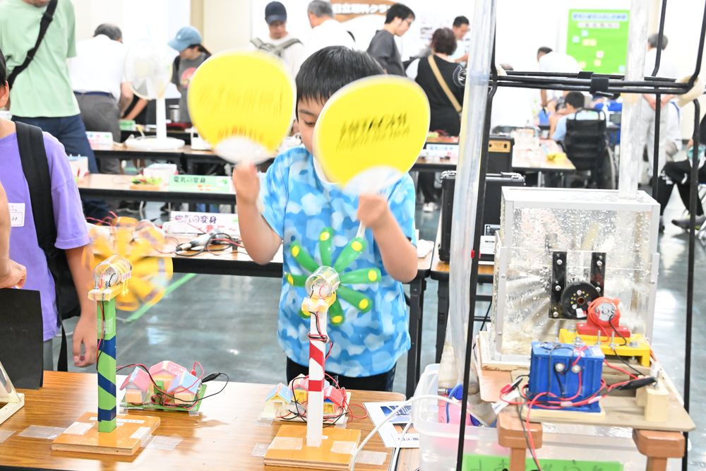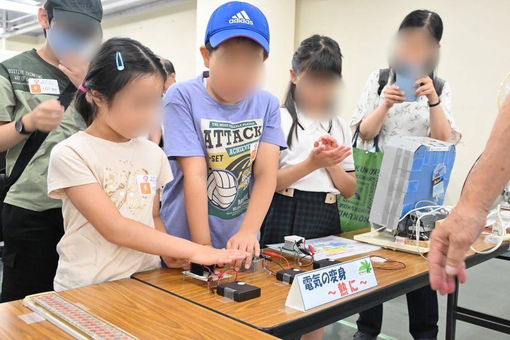 電気はどうつくられ、そのエネルギーが音、光、熱、力にどう変わるのか―。その一端を子どもたちが体験できるプログラム組んだ。風力、水力などといった発電所の仕組みを目に見えるようにした模型などを展示。電池と磁石で回るコップモーターの工作も伝授した。子どもたちは導線や磁石などと格闘し、アドバイスを受けつつ、どうにかコップモーターが完成すると「できたできた」とはしゃぐ場面も。楽しい夏の体験になったようだ。