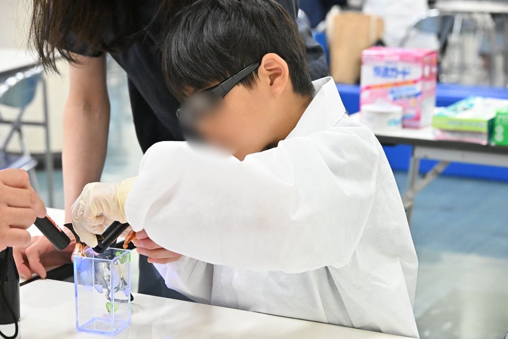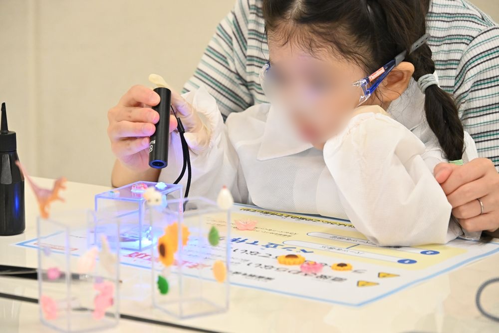 自社の事業や製品について認知を広げるためのプログラム。紫外線を当てると硬化する接着剤や嫌気性封着材など、日常生活では知る機会が少ない同社製品を紹介した。実際に接着剤を使い、貝殻や恐竜のフィギアなどで思い思いに飾り付けた世界に一つのペン立ては、子どもたちの宝物になりそうだ。神奈川県から来場した小学4年生の女の子は「接着剤の種類が多くて驚いた。紫外線を当てて固まる接着剤が面白かった」と目を輝かせていた。