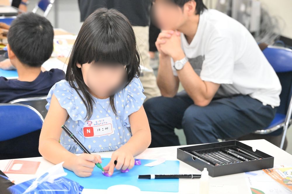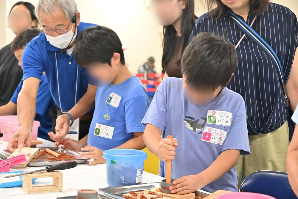 超硬工具の役割を、映像や体験を通じて学ぶプログラム。モノづくりを支える金型について解説したほか、粘土をドライヤーで加熱して固め、超硬工具に関するツールを模したキーホルダーづくりに挑戦。粘土を型に入れる工程では、親子が協力する光景もあった。自由に色を塗って完成したキーホルダーを子どもたちは喜んで持ち帰った。東京都から来た6歳の女の子は「型に入れたり色を塗ったりするのが楽しかった」と顔をほころばせた。