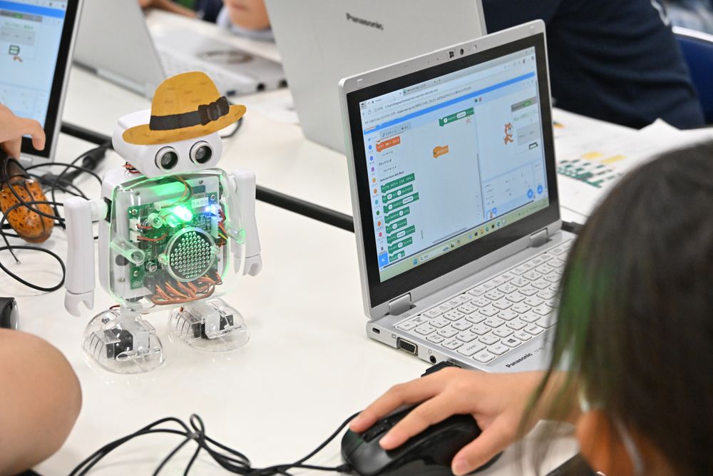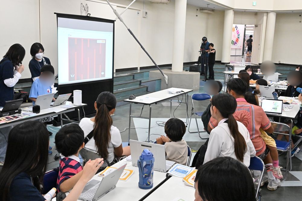 教育用プログラミング環境「Scratch」を使ったプログラミング体験。子どもたちは、ゼミ学生たちを先生にマンツーマンでプログラミングを学んだ。パソコン上のキャラクターの動きを設定して遊ぶゲームや、実際のロボット(Qumcum)を操作するものなど多彩な内容で、いずれも子どもたちの独創性が光った。東京都から来た小学1年生の男の子は「キャラクターを自分の思った通りに動かすのが面白かった」とプログラミングの楽しさを実感していた。