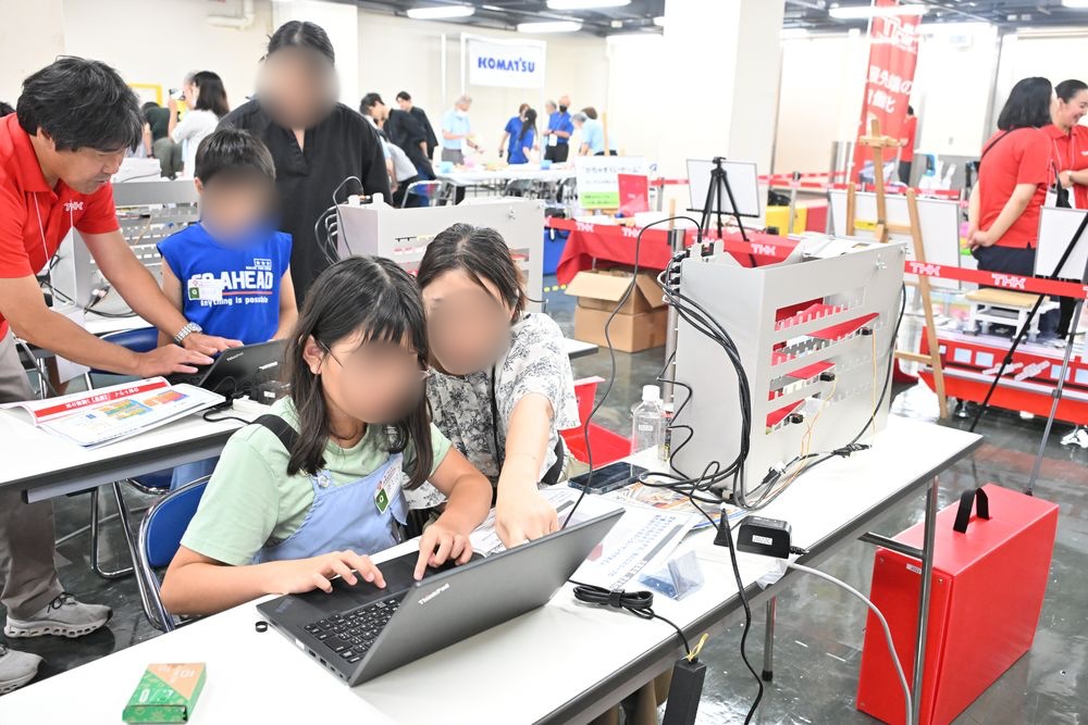 プログラミングとモノづくりを融合した「自動分別ごみ箱」の製作を通じ、自社事業を紹介した。重さの違う空き缶が自動的に予定のトレーに収まると、参加した子どもは飛び跳ねて喜んでいた。リニアモーションガイドによる重量物の移動や、ロボットの遠隔操作ができるコーナーもあり、家族で楽しそうに体験していた。東京都から来た小学3年生の女の子は「思い通りに分別ができてうれしかった」と満面の笑み。